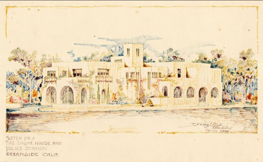 Irving J. Gill’s “Sketch for a Fire Engine House and Police Station, Oceanside, Calif.” (Sept. 30, 1929)